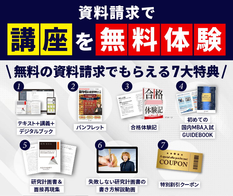九州大学MBAの入試対策として、課題論文や学習計画書の添削を受けたい方は、アガルートの国内MBA入学試験講座を利用してみてはいかがでしょうか。