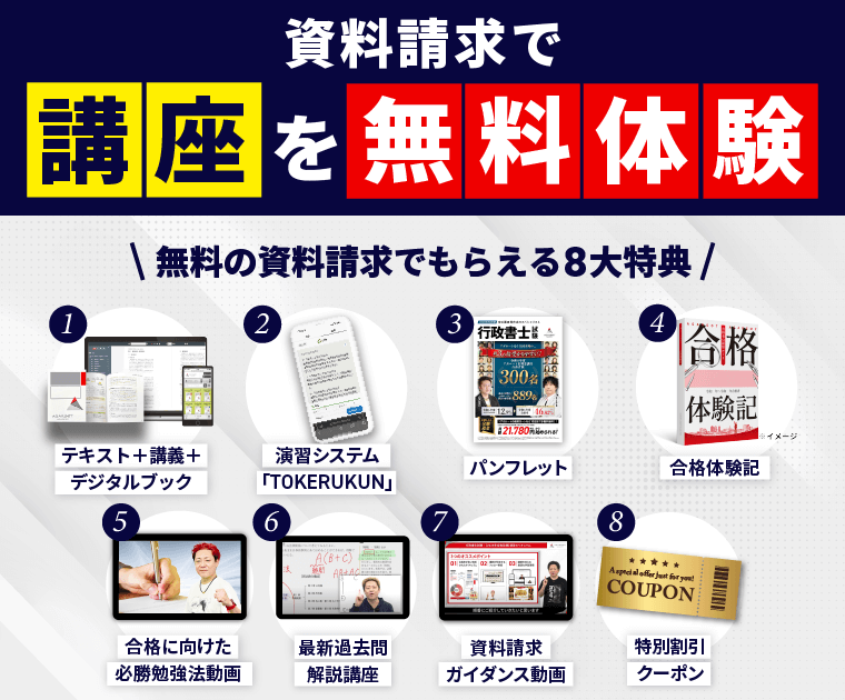 行政書士試験合格を 約15時間45分の民法総則&個人情報保護の講義が20日間見放題! 実際に勉強できる!行政書士試験対策のフルカラーテキスト 合格者の勉強法が満載の合格体験記! オンライン演習サービスTOKERUKUNを体験! 行政書士試験のテクニック解説動画で、必勝勉強法がわかる! 令和7年度行政書士試験全問!講師による解説講座 割引クーポンやセール情報が届く! 1分で簡単!無料!
